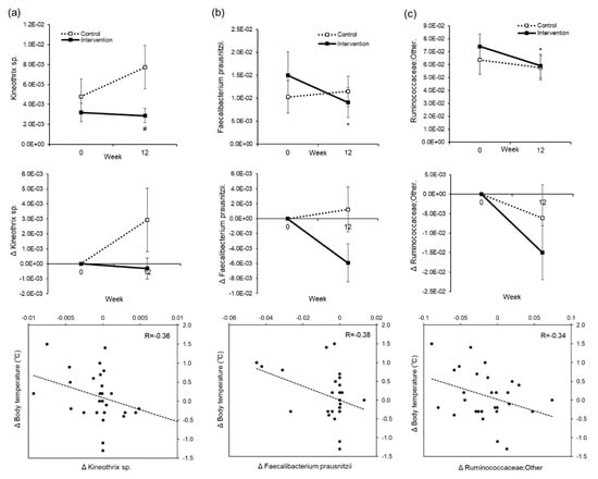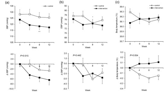 Table 2). They could affect some of parameters and might mask intervention effects, which is the limitation of this study. However, we confirmed that the major effects—which are on systolic blood pressure, body temperature, renal function, and microbiota—were not confounded by weight, according to multiple regression analysis.