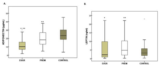A limitation to this study concerns the lack of the evaluation of body fat mass, which may be an influential factor of the ranges of adipokines [35]. Some authors reported that preterm infants have a greater percentage of adiposity at term-equivalent age, compared with term infants [73]. Therefore, this disorder might influence later metabolic outcomes. However, the current study presents several strengths. First, it benefits from a large group of children from a same hospital, a careful selection of the children, as well as from the exhaustiveness to diagnose EUGR. In addition, we exclusively selected school aged children to avoid puberty influence in all the metabolic and anthropometric parameters that can be affected by hormone status. Second, prior studies show ambiguous results regarding the mechanisms involved in the influence of prematurity on long-term health, but in this study, comparison of data was performed from three well-defined groups of children, which may help to assess such mechanisms. Third, unlike other studies, we analyzed both perinatal factors and long-term data of preterm children. It includes comprehensive standardized measurements of biochemical variables and, more importantly, this is a pioneer study of adipokines conducted with a group of premature children, with and without EUGR, compared with healthy children.