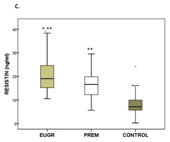 Up to the present, the available literature focusing on the relationship between prematurity and resistin levels has been limited and inconsistent. In a study by Martos-Moreno et al. [48], preterm neonates had higher resistin levels than full-term neonates. Conversely, some authors observed decreased resistin concentrations in preterm infants, compared with full-term infants [60], whereas resistin levels were not correlated with GA in another study [61]. Beyond birth, some reports found that resistin levels were similar between preterm and full-term children at school age [53,62]. However, in our study, preterm prepubertal children exhibited higher resistin levels than term children, and resistin values were positively associated with prematurity. Regarding the role of postnatal growth in resistin levels, the results obtained in studies have also been contradictory. Some authors affirmed that SGA infants presented lower resistin concentrations than AGA infants [63], whereas other authors observed higher values [64]. Korhonen et al. [62] did not find an association between resistin concentrations and growth among 6- to 14-year-old former VLBW children. In our study, resistin concentrations were higher in EUGR preterm children than in healthy children, as reported earlier [19], but also higher than in PREM children. Therefore, our findings demonstrated that both preterm birth and EUGR might have an effect on AT dysfunction and higher resistin levels in childhood.