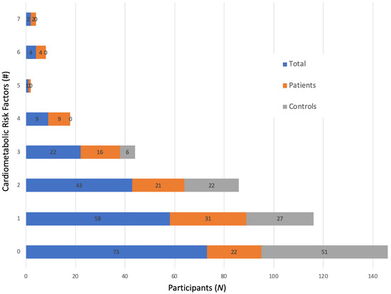 Variability in the Cardiometabolic Factors for the Total Sample, Patients with Major Depressive Disorder, and Student Control (n = 212). Data are presented as the number of cardiometabolic abnormalities present for the total, patient, and control samples (top) and normal versus abnormal values for each cardiometabolic factor for the total, patient, and control samples (bottom). Factors are treated as independent, continuous determinants of metabolic health. Normal values for cardiometabolic factors were considered the following; BMI <30 kg/m2. SBP/DBP <130/<85 mmHg; fasting glucose <100 mg/dL; fasting insulin <17 mIU/L; total cholesterol <200 mg/dL; LDL-C <100 mg/dL; Triglycerides <150 mg/dL, HDL > 40 mg/dL (men) or >50 mg/dL (women); WHR <0.85 (women) or <1.0 (men); HOMA-IR (HOMA2) < 2.0. Abbr. BMI= body mass index. DBP = diastolic blood pressure. HDL-C= high density lipoprotein cholesterol. HOMA-IR= homeostatic assessment model of insulin resistance. LDL-C= low density lipoprotein cholesterol. SBP = systolic blood pressure. WHR = waist-to-hip ratio.