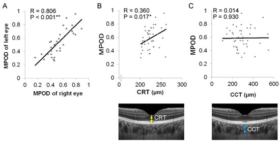 Correlation between the central retinal thickness (CRT), central choroidal thickness (CCT), and macular pigment optical density (MPOD). (A) Correlation of MPOD between the right and left eyes of the individuals was confirmed. (B) A positive correlation was seen between CRT and MPOD. The arrow in the OCT image indicates CRT. (C) No significant correlation was seen between CCT and MPOD. The arrow in the OCT image indicates CCT. ** P <0.01, * P <0.05.