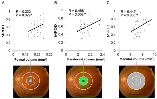 This study was limited by the relatively small number of participants and the lack of power analyses. Moreover, all participants were young or middle aged; no older individuals or patients with AMD could be considered. Thus, all participants were healthy and had no retinal diseases or age-related effects. Nonetheless, our results indicated that MPOD and retinal neural volumes vary among young, healthy people. This is consistent with the finding in our previous study that young and healthy volunteers also exhibit variations in visual function, as detected using spatial-sweep steady-state pattern electroretinography []. Moreover, we only measured MPOD at 1-degree and did not evaluate the spatial distribution of MP; nonetheless, we found that MPOD was correlated with the parafoveal and macular volumes in addition to the foveal volume. This suggests that the measurement of MPOD at 1-degree could be sufficient to estimate the condition of the retina, including that of the parafovea and macula, although further analyses are required.