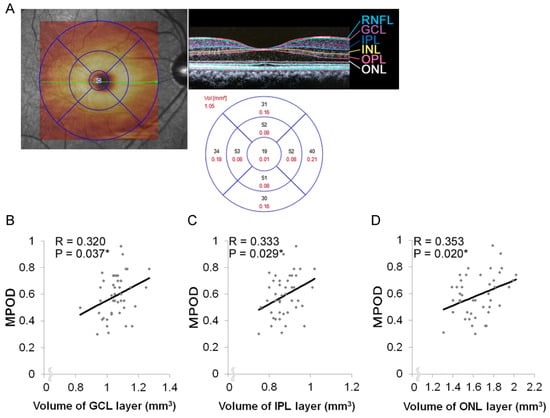 Correlation between the macular pigment optical density (MPOD) and volumes of retinal neural layers. (A) The macular area (left, the largest circle) was analyzed to calculate the volume of each retinal layer (right, upper), and the values obtained in each area (right, lower) were summed up to determine the values in the macular area (6-mm diameter). (B-D) MPOD was positively correlated with the retinal volumes of GCL (B), IPL (C), and ONL (D) in the macular area. RNFL retinal nerve fiber layer; GCL, ganglion cell layer; IPL, inner plexiform layer; INL, inner nuclear layer; OPL, outer plexiform layer; ONL, Outer nuclear layer; RPE, retinal pigment epithelium. * P < 0.05.