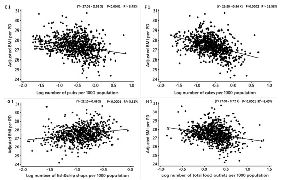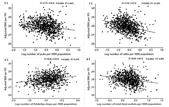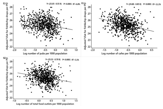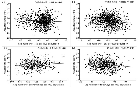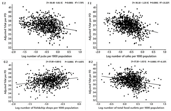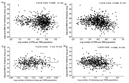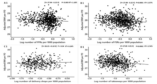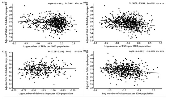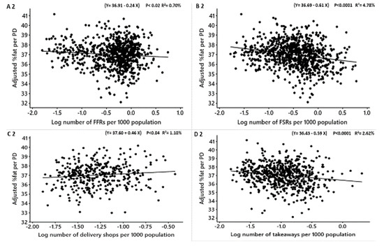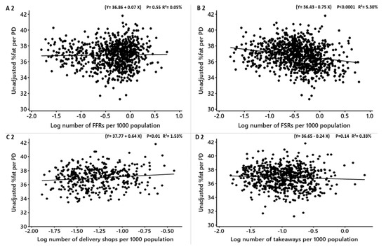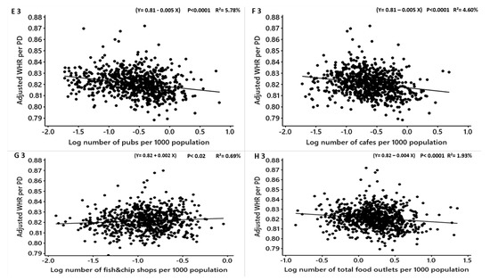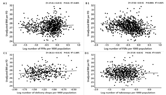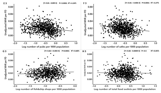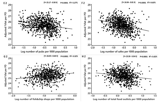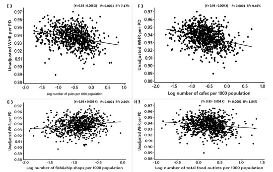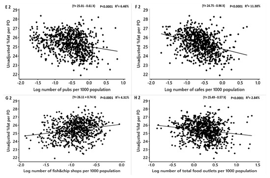 The density of delivery shops was positively but not significantly associated with the unadjusted means of BMI, %fat and WHR (Table 5; Figure 2). The unadjusted means of BMI and %fat were significantly positively linked to the density of fish and chip shops but not the mean WHR (BMI: converted β = 0.9 R2 = 3.72%, p < 0.0001; %fat: converted β = 1.8 R2 = 4.62% p < 0.0001) (Table 5; Figure 2), respectively. For one fish and chip shop opens in a PD, it may increase the means of the unadjusted BMI and %fat in females by 0.9 and 1.8 points respectively.