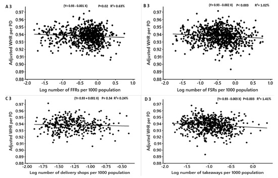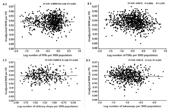 In females, the associations between the unadjusted obesity measures (BMI, WHR and %fat) and different types of food outlets per PD are shown in Table 5. The density of FFRs was positively significantly associated with WHR but not with the unadjusted BMI and %fat (WHR: converted β = 0.003 R2 = 1.77% p < 0.0001) (Table 5; Figure 2). For each new FFR opens, the unadjusted WHR may increase among females by 0.003 points on the WHR scale.