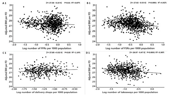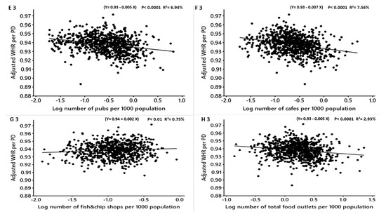 The association between the density of the total food outlets per Square Kilometre (KM2) and the mean BMI, %fat and WHR for both sexes after adjustment are shown in the Appendix A (Figure A1 and Figure A2). The associations were significantly negative or disappeared (male adjusted BMI: converted β = −0.16, R2 = 4.29%, p < 0.0001; male adjusted %fat: converted β = −0.13, R2 =1.20%, p < 0.0001; male adjusted WHR: converted β = −0.001, R2 = 0.68%, p = 0.01) (female adjusted BMI: converted β = −0.19, R2 = 3.14%, p < 0.0001; female adjusted %fat: converted β = −0.24, R2 = 2.41%, p < 0.0001; female adjusted WHR: converted β = −0.0002, R2 = 0.03%, p = 0.63) (Figure A1). The adjusted WHR among males and females was not significantly associated with the density of the total food outlets per KM2 per PD (male adjusted WHR: converted β = −0.0009, p = 0.01; female adjusted WHR: converted β = −0.0002, p = 0.63), respectively (Figure A2).