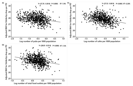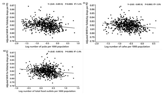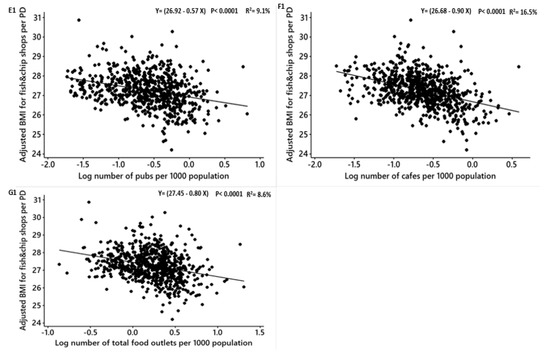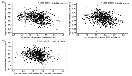 The association between the densities of food outlets and the adjusted obesity measures for females are shown in Table 7. The adjusted BMI and %fat, but not WHR, were significantly positively related to the density of fish and chip shops (converted β = 0.9, R2 = 5.31%, p < 0.0001; converted β = 1.4 R2 = 4.65%, p < 0.0001) (Table 7; Figure 4: G1, G3 and G2), respectively. This means if one fish and chip shop opens in a PD, BMI and %fat may increase by 0.9 and 1.4 respectively. The density of delivery shops was not related to the adjusted BMI, WHR and %fat (Table 7; Figure 4). The adjusted BMI, WHR and %fat was not significantly related to the density of FFRs (Table 7; Figure 4: A3, A1 and A2). The densities of FSRs, takeaways, pubs, cafes and total food outlets were significantly inversely associated with the adjusted BMI, WHR and %fat (Table 7; Figure 4).