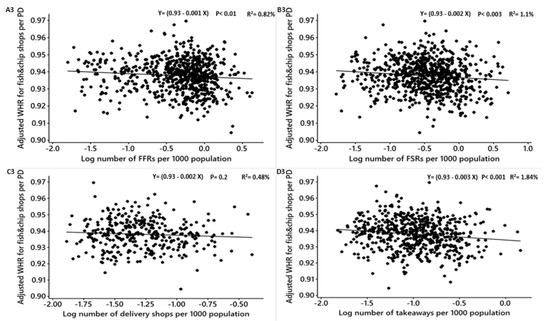 We found that the obesity measures in both males and females are associated with the density of fish and chip shops, and to see if fish and chip shops influence the relationships between obesity measures and the other types of food outlets, we further adjusted BMI, WHR and %fat for fish and chip shops beside the socio-economic factors and regressed against the densities of FFRs, FSRs, delivery shops, takeaways, pubs, cafes and total food outlets (Table 8 and Table 9). No associations were noticed between the density of food delivery shops and the obesity measures in both males and females (Table 8. Figure 5; C1, C2, and C3; Table 9. Figure 6; C1, C2, and C3). Also, no association between FFRs density and WHR in females after adjusting for fish and chip shops and socioeconomic factors (Table 9; Figure 6; A3). The densities of FFRs, FSRs, delivery shops, takeaways, pubs, cafes and total food outlets negatively significantly related to the adjusted BMI, %fat and WHR among both males and females (Table 8 and Table 9). No influence was noticed between the association between BMI, %fat and WHR among males and females and FFRs, FSRs, delivery shops, takeaways, pubs, cafes and total food outlets after the further adjustment for fish and chip shops density.