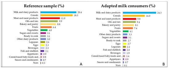 Percentage of the 18 food groups sources of the total energy intake (in %) among Spanish Pediatric Population (EsNuPI) (A) shows the reference sample and (B) the adapted milk consumers sample. There were statistically significant differences between both samples in the following food groups: Milk and dairy products, Cereals, Meat and meats products, Oils and fats, Fruits, Eggs, Beverages, Legumes, Cereal-based baby foods and Nuts (p < 0.005).