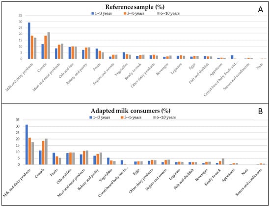 Percentage of the 18 food groups sources of the total energy intake (in %) among Spanish Pediatric Population (EsNuPI) study by age group: (A) shows the reference sample and (B) the adapted milk consumers sample.
