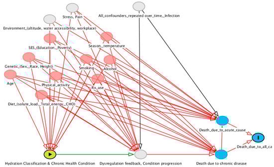The above paragraphs consider the potential for endogenous, interactive effects of hydration and health conditions on disease progression, as well as the potential for health conditions to simply confound effects of hydration on disease progression. If the underlying mechanism(s) involve(s) feedback of endogenous effects, then an individual’s stage in the feedback cycle at baseline would be an appropriate exposure for longitudinal mortality analysis. The effect to be estimated would be the joint effect of the hydration classification and chronic condition on mortality risk. If, on the other hand, baseline chronic health condition confounds the effect of hydration on disease progression, then the longitudinal effect to estimate would be the effect of hydration among individuals without chronic health conditions at baseline.