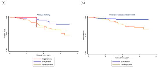 Figure 3 (a) illustrates the difference in survival for people who were hyponatremic or underhydrated vs. euhydrated. The unadjusted all-cause death rate was over two times higher for people who did not meet the hydration criteria in 2009–2012 (weighted hazard ratio (HR): 2.37, 95% confidence interval (CI): 1.02–5.50,