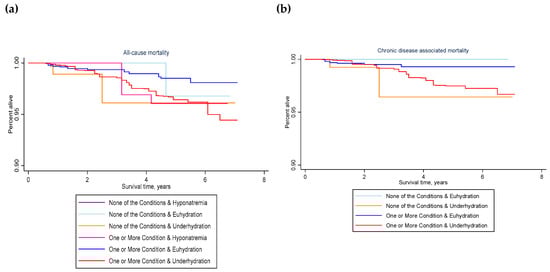 Figure 4 describes survival by the joint exposure of hydration classification and chronic health condition in 2009–2012.