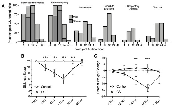 Observed sickness scores of mice and percent weight change over time following Cecal Slurry (CS) treatment. (A) Percentage of mice showing sickness behaviors and appearances. (B) Clinical Sickness Scores. (C) Weight loss. ** p < 0.01*** p < 0.001. Error bars plotted as mean ± SD.