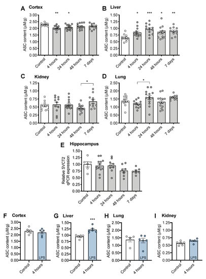 No decrease in brain ASC level was observed at 4 h following LPS treatment (Figure 2F, t(10) = 0.842, p = 0.4197). However, LPS treatment also induced upregulation of ASC synthesis in liver (Figure 2G, t(10) = 4.913, p < 0.001). No changes were observed in lung (Figure 2H, t(9) = 0.246, p = 0.8111), or kidney (Figure 2I, t(10) = 2.066, p = 0.0658).