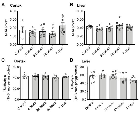 Indicators of oxidative stress following CS treatment. Malondialdehyde (MDA) in cortex (A) and liver (B) or sulfhydryls in cortex (C) and liver (D). Error bars plotted as mean ± SEM.
