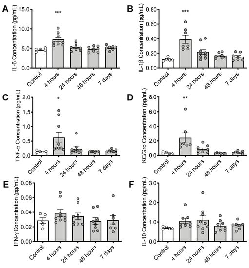 In cortex, expression of several proinflammatory cytokines was elevated at 4 h post CS treatment including interleukin 6 (IL-6: F(4, 31) = 8.356, p < 0.001), interleukin 1β (IL-1β: F(4, 31) = 9.742, p < 0.001), tumor necrosis factor alpha (TNFα: F(4, 33) = 4.261, p = 0.0069), and chemokine (C-X-C motif) ligand 1 (CXCL1, KC/Gro: F(4, 30) = 7.091, p < 0.001) (Figure 4A–D). Cytokine expression levels returned to normal by 48 h post CS treatment. More modest increases in interferon gamma (INFγ: F(4, 33) = 0.9214, p = 0.4632) and interleukin 10 (IL-10: F(4, 32) = 1.442, p = 0.2430) were not statistically significant (Figure 2E,F).