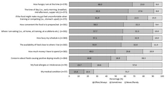 Figure: the percentage of athletes (n = 385), who rated how frequently (never/rarely, sometimes and often/always) 11 items influence their food choices.