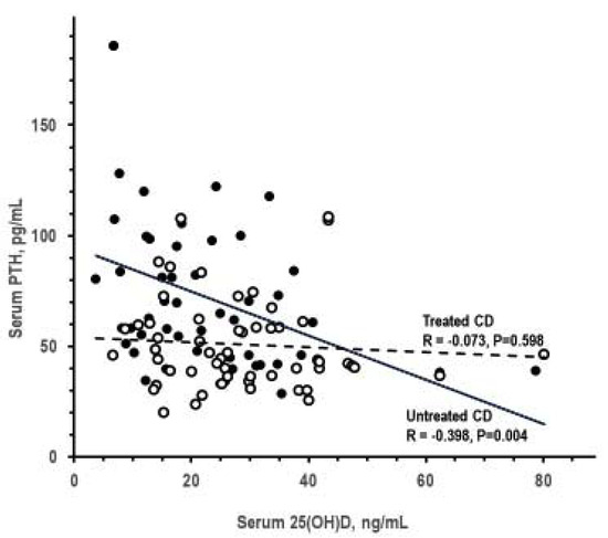 Pearson correlation between serum 25(OH)D and serum parathyroid hormone (PTH) in untreated CeD and treated CeD (closed and open symbols, respectively).