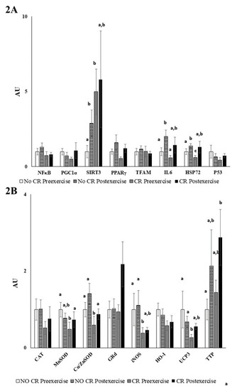 Calorie restriction significantly downregulated the gene expression of antioxidant enzymes (MnSOD and Cu/Zn SOD), enzymes related with the NO synthesis (iNOS), mitochondrial uncoupling proteins (UCP3), and repairing stress protein (heat shock protein 72, HSP72), as shown in Figure 3. On the other hand, calorie restriction enhanced the expression of silent information regulators (SIRT3) and the vitamin E carrier protein alpha-tocopherol transfer protein (α-TTP), which was additionally upregulated by exercise (Figure 3). In addition, neither calorie restriction nor acute exercise significantly influenced the gene expression of the antioxidant enzymes catalase, glutathione reductase and heme oxygenase (HO-1), or the basal expression of NFκB, PGC1α, PPARγ, TFAM, and p53. Acute exercise enhanced the gene expression of MnSOD, UCP3, and α-TTP only after the calorie restriction intervention. On the contrary, acute exercise without calorie restriction maintained the basal expression of these genes but increased the expression of the inflammatory protein IL6 and SIRT3. Acute exercise in both calorie restriction and control conditions enhanced the expression of the repair stress proteins HSP72.