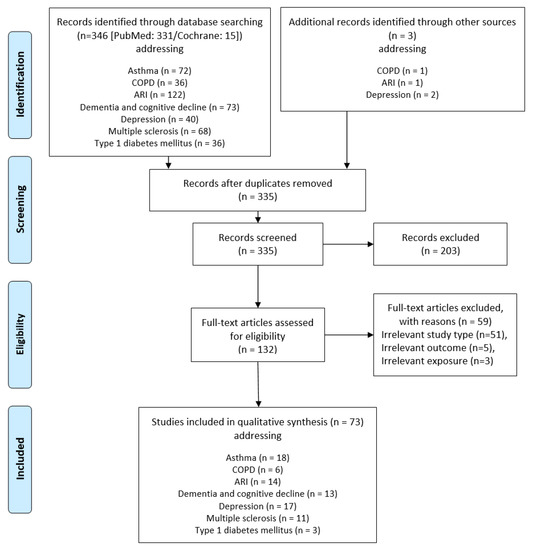 A total of 349 articles were identified for the seven diseases (Figure 1). After removal of 14 duplicates, 335 articles were screened by title and abstract. Of the 335 articles, 203 did not match our inclusion criteria and were thus excluded. For assessment 132 full-text articles were obtained and finally 73 SRs (with or without MAs) of prospective cohort studies and RCTs were included in qualitative synthesis (see Supplemental Tables S2–S26). Main reasons for the exclusion of 59 assessed full-text articles were an irrelevant study type (e.g., umbrella/narrative review, only/mainly cross-sectional and/or case-control studies) or an irrelevant outcome (e.g., prevention of falls in elderly, quality of life, poststroke depression). More detailed reasons for exclusion are shown in the Supplemental Figures S1–S7.