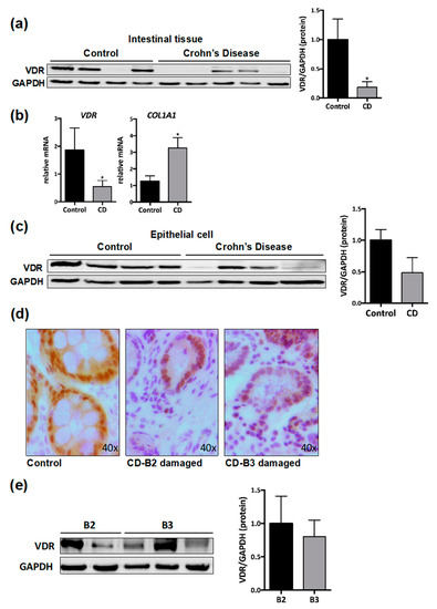 Diminished vitamin D receptor (VDR) expression in damaged intestinal resections from Crohn’s disease (CD) patients. (a) A representative Western blot image of VDR protein in lysates of total mucosa from control (n = 8) and from CD patients (n = 10). The graph shows VDR protein expression vs. Glyceraldehyde 3-phosphate dehydrogenase (GAPDH) represented as fold induction vs. control mucosa. (b) mRNA expression (expressed as fold induction vs. control) of different genes vs. β-actin in total mucosa from control (n = 5) and CD patients (n = 10). In (a) and (b), bars in graph represent mean ± s.e.m. and significant differences vs. the control group are shown by * p < 0.05. (c) Representative Western blot from lysates of epithelial cells isolated from intestinal tissue of controls (n = 4) and CD patients (n = 4). Graph shows protein expression vs. GAPDH represented as fold induction vs. control. (d) Representative images showing VDR immunostaining in the mucosa of control and CD patients. (e) A representative Western blot image of VDR protein in lysates of total mucosa from CD patients with a stenotic (B2, n = 2) or penetrating (B3, n = 3) behavior. The graph shows VDR protein expression vs. GAPDH represented as fold induction vs. B2-CD.