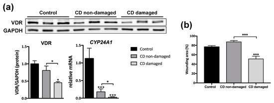 VD, compared with vehicle, induced a significant increase in VDR protein levels in control fibroblasts (87 ± 29.2%), in fibroblasts from non-damaged tissue of CD patients (48 ± 25.6%) and in those from damaged intestine (87 ± 31.6%) (Figure 3a). In fibroblasts from damaged tissue of CD patients, VD significantly increased, 48 h after wounding, the percentage of wound (66.75 ± 5.94%) compared to that detected in vehicle-treated cells (51.9 ± 5.4%) (Figure 3b).