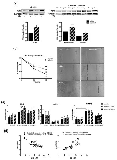 The basal mRNA expression of VDR, and α-smooth muscle actin (α-SMA) was similar between control fibroblasts (1.1 ± 0.2 and 2.6 ± 1.3, respectively), CD fibroblasts from non-damaged tissue (1.9 ± 0.2 and 0.5 ± 0.2, respectively), and CD fibroblasts from damaged tissue (1.8 ± 0.4 and 1.3 ± 0.4, respectively). Basal metalloproteinase 2 (MMP2) mRNA levels were significantly higher in fibroblasts from non-damaged tissue of CD patients (3.5 ± 0.4) than in control cells (1.3 ± 0.5) (Figure 3c). Treatment with VD significantly increase VDR mRNA levels, compared with vehicle, in fibroblasts from non-damaged tissue of CD patients (36.2 ± 3.6%) (Figure 3c), while it failed to significantly modify the mRNA expression of α-SMA or MMP2 in any cell analyzed. However, a positive and significant correlation was detected between VDR and MMP2 mRNA expression, while a negative correlation was detected between α-SMA mRNA and VDR mRNA levels (Figure 3d).