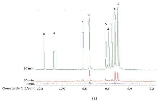 (a) Expanded aldehydic-CHO proton (9.20–10.20 ppm) regions of 600 MHz 1H-NMR spectra of corn oil exposed to laboratory-simulated frying episodes at 180 °C for periods of 0 (blue), 30 (red) and 90 min. (green). Typical spectra are shown. Abbreviations: -CHO function resonances of 1, trans-2-alkenals; 2, trans,trans-2,4-alkadienals; 3, 4,5-epoxy-trans-2-alkenals; 4, combined 4-hydroxy and 4-hydroperoxy-trans-2-alkenals; 5, cis,trans-2,4-alkadienals; 6, n-alkanals; 7, low-molecular-mass short-chain n-alkanals, particularly propanal and n-butanal from the peroxidation of linolenoylglycerols; 8, cis-2-alkenals, potentially arising from the thermally-induced isomerism of trans-2-alkenals; 9, unassigned aldehyde doublet resonance. All resonances visible are doublets, with the exception of signals 6 and 7, which are triplets (J = 1.73 and 1.74 Hz respectively). Samples were prepared for 1H NMR analysis by the method described in [11], and spectra were acquired on a JEOL-ECZR600 NMR spectrometer (De Montfort University facility, Leicester, UK) operating at a frequency of 600.17 MHz. (b) Heatmap profile showing the time-dependent generation of the three major secondary aldehydic LOPs, i.e., trans-2-alkenals (t-2-Alken), trans,trans-2,4-alkadienals (t,t-A-2,4-D) and n-alkanals (n-Alk) in canola (CAO), coconut (COO), extra-virgin olive (OO) and sunflower (SFO) oils exposed to LSSFEs for periods of 0, 5, 10, 20, 30 60 and 90 min. (ordinate axis codes 00, 05, 10, 20, 30, 60 and 90 respectively). Generalised log- (glog-) transformed aldehyde concentrations (mmol/mol. FA) are shown on the right-hand side abscissa axis. Deep blue and red colourations depict extremes of low and high concentrations respectively. The left-hand abscissa axis shows agglomerative hierarchal clustering of these 3 aldehyde classes, which demonstrate that trans,trans-alka-2,4-dienals, which are generated only from PUFA peroxidation, have some independence (orthogonality) from a combination of trans-2-alkenals and n-alkanals, which arise from the fragmentation of both MUFA and PUFA hydroperoxide sources. Manufacturer-specified SFA, MUFA and PUFA contents of these oils were 7.5, 63.7 and 28.8% for canola oil; 90.1, 8.1 and 1.8% (w/w) respectively for coconut oil; 13.0, 77.4 and 9.4% for extra virgin olive oil; and 10.3, 29.3 and 60.4% (w/w) for sunflower oil. For canola oil, 9.8% of the 28.8% (w/w) PUFA content was linolenic acid (as linolenoylglycerols).