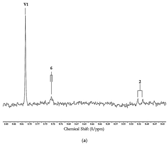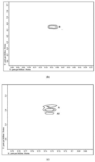 600 MHz 1D 1H and 2D 1H-1H correlation spectroscopy (COSY) NMR spectral profiles of a C2HCl3 extract of a commercially-available chocolate hazelnut spread product. (a) Expanded 9.40–9.90 ppm region of a 1D spectrum of this extract showing an intense –CHO function resonance arising from the flavouring agent vanillin (abbreviated V1), along with 1H-NMR-detectable traces of trans,trans-2,4-alkadienals (2) and long-chain n-alkanals (6). (b) Expanded 5.655–6.670 (F1 axis) and 9.364–9.660 ppm (F2 axis) region of a 1H-1H COSY spectrum acquired on this extract, revealing connectivities between the C1-CHO and C2-CH=CH- resonances of trans,trans-2,4-alkadienals. (c) Expanded 2.230–2.670 (F1 axis) and 9.668–9.797 ppm (F2 axis) region of the 1H-1H COSY spectrum shown in (b), showing differential molecular couplings between one major (A) and one relatively minor (A1) long-chain n-alkanal species. (d) and (e), Expanded 5.7–8.2 and 3.4–4.2 ppm regions of the 1D spectrum shown in (a) respectively, with resonances ascribable to the C5H/C6H (V2) and C2H (V3) aromatic, and C3-OCH3 (V4) protons of vanillin indicated. DV represents a tentative assignment to the C3-OCH3 function of divanillin, a vanillin oxidation product. Further abbreviations: -OOH, lipid hydroperoxide-OOH function resonance; CHCl3, residual chloroform; X, residual chloroform 13C satellite.
