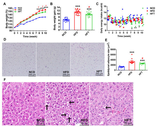 As shown in Figure 1, the percent body weight of the mice a fed high-fat diet (HFD and HFT group) increased more quickly than that of mice fed a normal chow diet (NCD group) and, consequently, the mice in HFD and HFT groups showed a significantly higher body weight gain than those in the NCD group. It was worth noting that body weight difference between the HFD and HFT groups occurred after 7 weeks of treatment and finally, the HFT group showed a significantly lower body weight gain compared with the HFD group after the 10-week treatment. As shown in Figure 1C, the HFT group exhibited a significantly decreased energy intake during week 7–9. Although significant differences were not observed regarding the weight of the liver and epididymal fat pad between HFD and HFT groups (Table 2), the H&E staining showed that the HFT group had a significantly smaller size of adipocyte in epididymal adipose tissue and less multi-locular lipid droplets in the liver (Figure 1D–F).