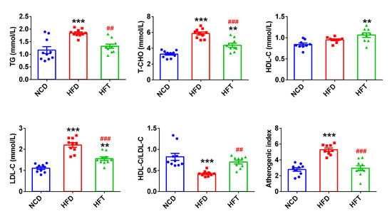 HFD markedly elevated the serum levels of TG, T-CHO and LDL-C, whereas the administration of T17 significantly attenuated the elevation caused by HFD (Figure 2). Noticeably, the HFT group showed a significantly higher level of HDL-C than the NCD group, and consequently, the HDL-C/LDL-C value in the HFD group was significantly lower than that in the NCD and HFT groups, and the inverse was true for the atherogenic index.