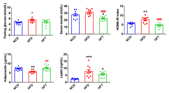 There was no significant difference concerning the fasting plasma glucose levels in three groups (Figure 3). However, the fasting plasma glucose level in the HFD group was higher, though not significantly, than that in the NCD group (p = 0.073). The mice administered with T17 had a significantly lower level of serum insulin and a significantly reduced HOMA-IR index than those in NCD and HFD groups (Figure 3). As for the adipokines, the consumption of HFD significantly impacted the serum levels of adiponectin and leptin. Treatment with T17 significantly restored the loss of the adiponectin caused by HFD, and tended to decrease, though not significantly, the high leptin level induced by HFD (5.73 vs. 7.86).