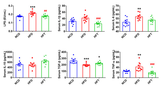 As shown in Figure 4, the HFD group had significantly higher levels of LPS and pro-inflammatory cytokines, such as IL-6, TNF-α and IL-1β (p = 0.0549), than the NCD group. T17 administration (HFT group) significantly decreased the levels of LPS, IL-1β, and TNF-α. In addition, the two anti-inflammatory cytokines, TGF-β and IL-10, were both higher, although not significantly, in the HFT group than in the HFD group.