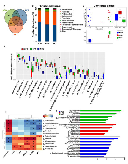 HFD and T17 administration altered the diversity and composition of gut microbiota. (A) Venn Diagram of operational taxonomic units (OTUs), (B) bar plot of microbial communities at the phylum level, (C) PCoA plot based on unweighted UniFrac distances, (D) boxplot based on the significantly altered genera, (E) spearman’s correlations between key microbes and metabolic parameters, (F) the discovered genera (biomarkers) using linear discriminant analysis effect size with 2.5 as the LDA score threshold. (+ p < 0.05, * p < 0.01).