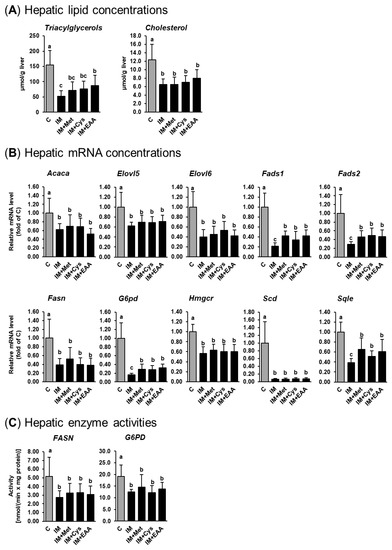 Hepatic TG and cholesterol concentrations (A), relative hepatic mRNA levels of lipogenic and cholesterogenic genes (B), and hepatic activities of lipogenic enzymes (C) in obese Zucker rats fed semi-synthetic diets with either casein (C), insect meal (IM), IM with additional methionine (IM + Met), IM with additional cysteine (IM + Cys) or IM with additional essential amino acids (EAA) for 4 weeks. Bars represent means ± SD for n = 10 animals per group. Bars without a common letter differ, p < 0.05. Abbreviations: ACACA, acetyl-CoA carboxylase alpha; ELOVL5, fatty acid elongase 5; ELOVL6, fatty acid elongase 6; FADS1, fatty acid desaturase 1; FADS2, fatty acid desaturase 2; FASN, fatty acid synthase; G6PD, glucose-6-phosphate dehydrogenase; HMGCR, 3-hydroxy-3-methylglutaryl-CoA reductase; SCD, stearoyl-CoA desaturase; SQLE, squalene epoxidase.