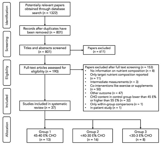 The systematic database search retrieved 1322 potentially relevant papers. After title and abstract screening, 190 papers remained for the full text screening. Finally, 37 papers were included in the systematic review. A flowchart of the study selection process is presented in Figure 1.
