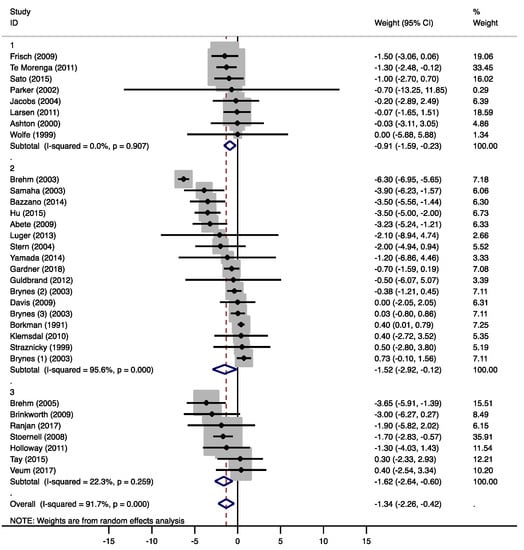 Combining the results of all LCD groups, a significant weight loss (−1.34 kg, 95% CI −2.26 to −0.42 kg, p = 0.004) was observed. Differences between the groups did not however reach statistical significance (group 2 vs. 1: −0.89 kg, 95% CI −2.35 to 0.58 kg, p = 0.226; group 3 vs. 1: −0.95 kg, 95% CI −2.72 to 0.82 kg, p = 0.280, Figure 2 and Supplementary Figure S2A). A meta-analysis by Johnston et al. [] also found that significant weight loss was found with any low-carbohydrate diet and that weight loss differences between the diets were small. In most studies, weight loss was due to a lower energy intake, although energy intake was often not explicitly restricted in the LCD groups. The unintended reduction in energy intake can be explained by the satiating effect of fat and protein, an appetite-suppressing effect of ketones, as well as increased attention to dietary behavior [,]. However, not all studies that showed a significant weight loss effect of the LCD reported a lower energy intake compared to the MCD. The authors explained these findings by unreliable food records, or an increased energy expenditure caused by physical activity or possible thermogenic effects of the LCD [,].