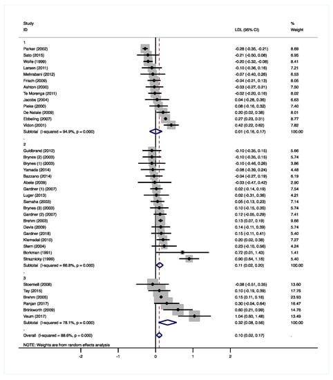 Compared to the MCDs, significantly higher LDL-C concentrations were observed with the LCDs (0.10 mmol/L, 95% CI 0.02 to 0.17 mmol/L, p = 0.009). These effects were significantly different between the three CHO groups with more pronounced increases in the very-low CHO diet compared to the moderate-low CHO diet (group 3 vs. 1: 0.35 mmol/L, 95% CI 0.07 to 0.62 mmol/L, p = 0.015, Figure 3 and Supplementary Figure S2C). Differences between the moderate-low and the low CHO group did not reach statistical significance (group 2 vs. 1: 0.13 mmol/L, 95% CI −0.08 to 0.33 mmol/L, p = 0.215). It is well-known that SFA [], dietary cholesterol [], as well as fiber intakes [] affect plasma total and LDL-C concentrations. In this review, the studies that found increased total cholesterol and LDL-C concentrations reported increases in SFA intakes, which were often accompanied by increased dietary cholesterol or decreased fiber intakes (Supplementary Tables S1–S3).