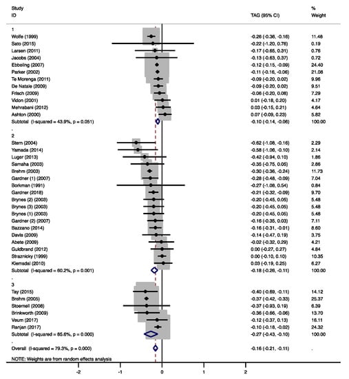 Overall, TAG concentrations significantly decreased with the LCDs (−0.16 mmol/L, 95% CI −0.21 to −0.11 mmol/L, p < 0.001). Based on earlier studies [,], it was expected that a more pronounced CHO reduction would result in lower TAG concentrations. Indeed, significant differences between the CHO groups were detected (group 2 vs. 1: −0.13, 95% CI −0.25 to −0.01 mmol/L, p = 0.028; group 3 vs. 1: −0.19, 95% CI −0.35 to −0.04 mmol/L, p = 0.017, Figure 4 and Supplementary Figure S2E). The studies that showed beneficial effects on TAG concentrations and provided information on the fatty-acid composition, also reported an increase in PUFA intake (Supplementary Table S1).