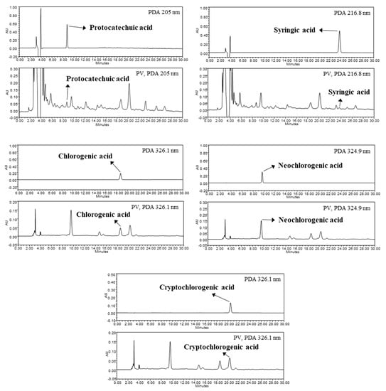 Phenolic compounds in Prunus mume vinegar (PV) analyzed by HPLC. Protocatechuic acid (205 nm, 8.774 min); syringic acid (216.8 nm, 23.857 min); chlorogenic acid (326.1 nm, 18.663 min); neochlorogenic acid (324.9 nm, 9.660 min); cryptochlorogenic acid (326.1 nm, 20.395 min).
