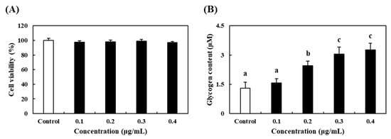 Glycogen content was analyzed according to the method described by Cho et al. []. Briefly, 0.2 g of tissues from liver and muscle were reacted with 400 μL of 30% potassium hydroxide solution, boiled for 30 min and then cooled at 25 °C. Next, 1 mL of ethanol was added to the mixture and it was centrifuged at 6000× g and 4 °C for 15 min. The supernatant was subsequently removed and the pellet was mixed with 0.5 mL of distilled water, after which 0.2% of anthrone solution was added to hydrolyze the glucose. Finally, the absorbance was measured at 620 nm with a spectrophotometer.