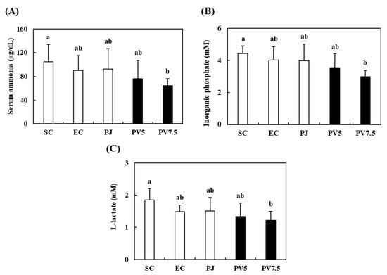 Effect of PV on serum (A) ammonia, (B) inorganic phosphorus, and (C) lactate in exhausted rats. Data values are expressed as the means ± S.E. (n = 6). SC: sedentary control, EC: exercised control, PJ: Prunus mume juice, PV5: 5% Prunus mume vinegar drink, PV7.5: 7.5% Prunus mume vinegar drink. Different letters on the bar are significantly different (p < 0.05).