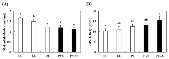 Effects of PV on (A) malondialdehyde and (B) glutathione peroxidase activities in rats exhausted by exercise. Data values are expressed as the means ± S.E. (n = 6). SC: sedentary control, EC: exercised control, PJ: Prunus mume juice, PV5: 5% Prunus mume vinegar drink, PV7.5: 7.5% Prunus mume vinegar drink. Different letters on the bar are significantly different (p < 0.05).