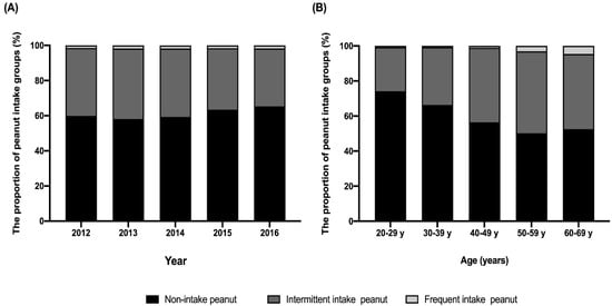 Trend in peanut intake by year and age groups in Koreans. (A) The weighted proportion of the non-intake group increased by year, and that of the frequent intake group was relatively constant (p for trend <0.001). (B) The weighted percentage of the non-intake group showed a declining trend based on older age, while that of the frequent intake group increased with older age (p for trend <0.001).