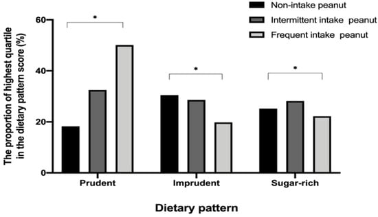 The weighted proportion of the highest quartile of dietary pattern score by peanut intake groups. Study subjects who rarely consumed peanuts, who consumed peanuts 0.25 to 4 times per week, and who consumed peanuts 0.7 to 3 times per day were classified into a non-intake group, an intermittent intake group, and a frequent intake group, respectively. * p < 0.05.
