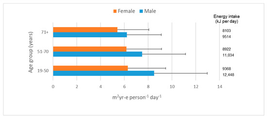 The cropland scarcity footprints of Australian adult daily diets averaged 7.09 m2yr-e per person. They were generally lower for females (6.15 m2yr-e per person) than males (8.02 m2yr-e per person; Supplementary Table S4) and generally lower for older adults such as those in the 71 years and above age category (Figure 1). In part, this is explained by differences in overall energy intake. Males in the 19–50-year age group had the highest average cropland scarcity footprint (8.49 m2yr-e per person) as well as the highest average energy intake (12,448 kJ per day). Females in the 71 years and above age category had both the lowest average cropland scarcity footprint (5.40 m2yr-e per person) and lowest average energy intake (8103 kJ per day). Overall, variation between individuals in dietary energy intake explained around 45% of the variation in dietary cropland scarcity footprint (R2: Females 0.43, Males 0.47). This is a marginally stronger linear relationship than has previously been reported in Australia for dietary greenhouse gas emissions and for dietary water scarcity footprints whereby around one-third of the variation was explained by variation in dietary energy intake [49,61]. In the case of cropland biodiversity footprint and cropland malnutrition footprint, the average values for Australian adult daily diets were 1.19 × 10−12 PDF per person and 2.82 × 10−5 DALY per person, respectively (Supplementary Table S4). These cropland footprint results also varied by gender and age group, reflecting again, in part, variation in total energy intake (cropland malnutrition footprint R2: Females 0.40, Males 0.43; cropland biodiversity footprint R2: Females 0.34, Males 0.32).