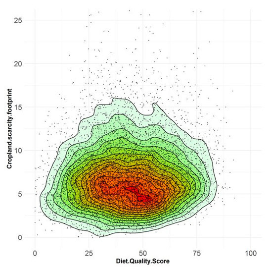 Cropland scarcity footprint (m2ye person−1 day−1) and diet quality score (range 0–100). Scatterplot showing diversity of individual adult daily diets reported in the Australian Health Survey (n = 9341). Shading indicates density of points from high (red) to low (green).