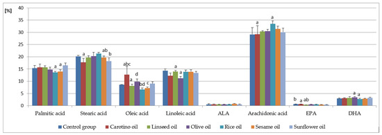 Contents of selected fatty acids in serum of rats supplemented with selected oils (%). Data were expressed as mean values ± standard deviation. Bars with the same superscript (a, b, c, or d) above referring to one fatty acid are significantly different in one-way ANOVA followed by RIR Tukey’s post-hoc test (p < 0.05). ALA—α-linolenic acid; EPA—eicosapentaenoic acid; DHA—docosahexaenoic acid.