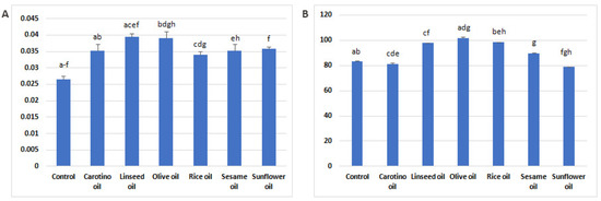 Activities of Δ6- and Δ5-desaturases in serum of experimental rats were affected by the dietary supplementation (Figure 2A,B). Differences in the desaturase activity were found among experimental groups. The Δ6-desaturase activity tends to be significantly lower in control group compared to groups supplemented with oils. The group that received linseed oil was characterized by the highest D6D activity (0.0394 ± 0.05) (Figure 2A). High D6D activity and the highest D5D activity were found in serum of the rats supplemented with olive oil (Figure 2A,B).
